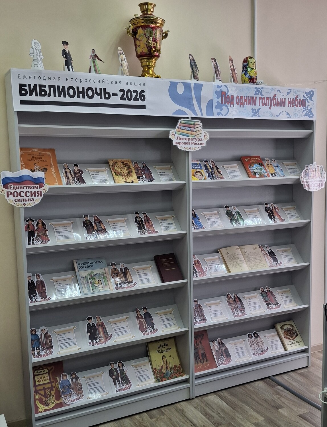 Для гостей была подготовлена книжно - иллюстративная выставка «Под одним голубым небом». На ней были представлены иллюстративные издания о костюмах, кухне, народных промыслах, а также художественная литература народов России, подчеркивая идею «единства в многообразии».