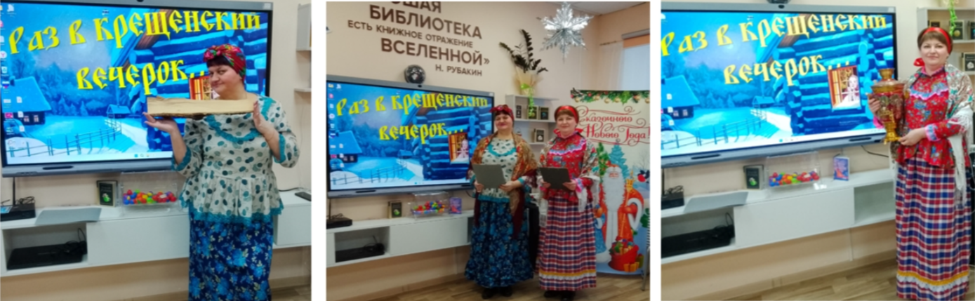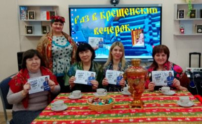 На Крещение фольклорные посиделки в центральной библиотеке имени М.С. Малинина собрали членов клуба "Гармония". Время между Рождеством и Крещением на Руси всегда считалось самым веселым, ярким и загадочным: святочные хороводы и катания, шумные колядки и волнующие гадания. Все атрибуты и традиции собрали для гостей ведущие – Наталия Фролова и Елена Орлова.
