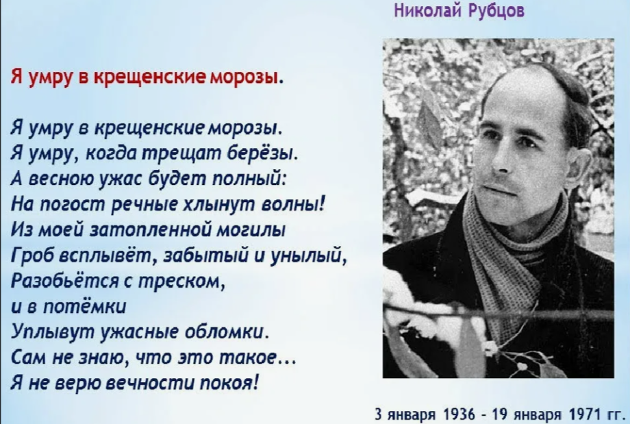 Первая известность пришла к обосновавшемуся в Вологде и работающему в местных газетах Рубцову в 1965-1966 гг. Печальные и красивые рубцовские строки нашли массового читателя только в конце 1970-х – начале 1980-х гг. Несколько десятков стихотворений поэта были положены на музыку – песни на стихи Рубцова исполняли известные музыканты: Александр Барыкин, Александр Градский, Татьяна Буланова, Марина Капуро, группа «Форум» и другие.