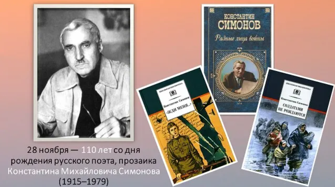 Константин Симонов (при рождении - Кирилл) (1915-1979) родился в Петрограде 28 ноября 1915 года в семье генерал-майора, поэтому его жизнь с детства была связана с армией. Интересный факт: свое имя он сменил из-за дефекта дикции - будущий писатель не выговаривал букву «р».