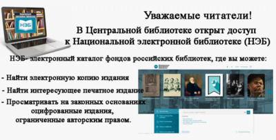 В центральной библиотеке имени М.С. Малинина зарегистрирован личный кабинет в НЭБ. Каждый желающий получить нужную информацию, книгу, издание в электронном виде может обратиться в ЦБ, скопировать требуемое на флэш-носитель и работать с ним дома, на личном компьютере. И наслаждайтесь раритетными экземплярами сколько душе угодно! НЭБ предлагает погружение в чтение без ограничений, ведь все издания доступны в любое время, с любого устройства. Читайте с удовольствием! |