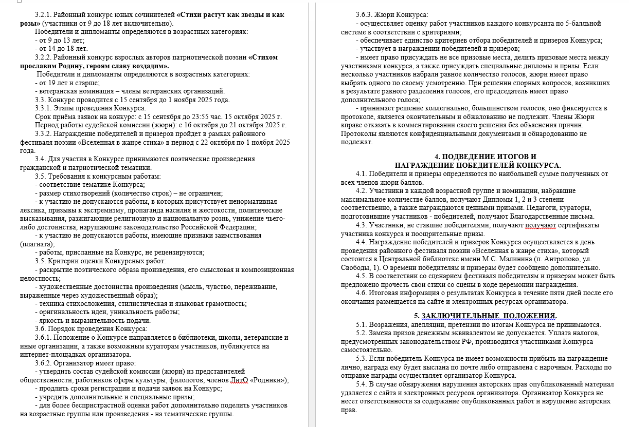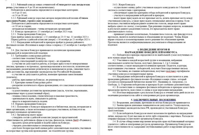 Он должен стать венцом сразу двух объявленных к юбилейному событию конкурсов - исполнителей (чтецов) патриотической поэзии «Родников» и авторов (сочинителей). К участию приглашаются как юные исполнители и сочинители (нижний порог - 9 лет), так и взрослые (верхний возраст участников не ограничен). в конкурсном состязании выделена даже специальная номинация - ветеранская, «родники» очень надеются на активное участие членов ветеранских организаций со всего района.