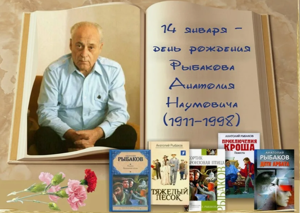 14 января исполнилось 115 лет со дня рождения в еврейской семье небольшого села Держановка Черниговской области Анатолия Аронова, Рыбаков – его литературный псевдоним. Анатолий Наумович стал первым среди писателей, кто начал открыто говорить о страшном времени репрессий и культа личности.