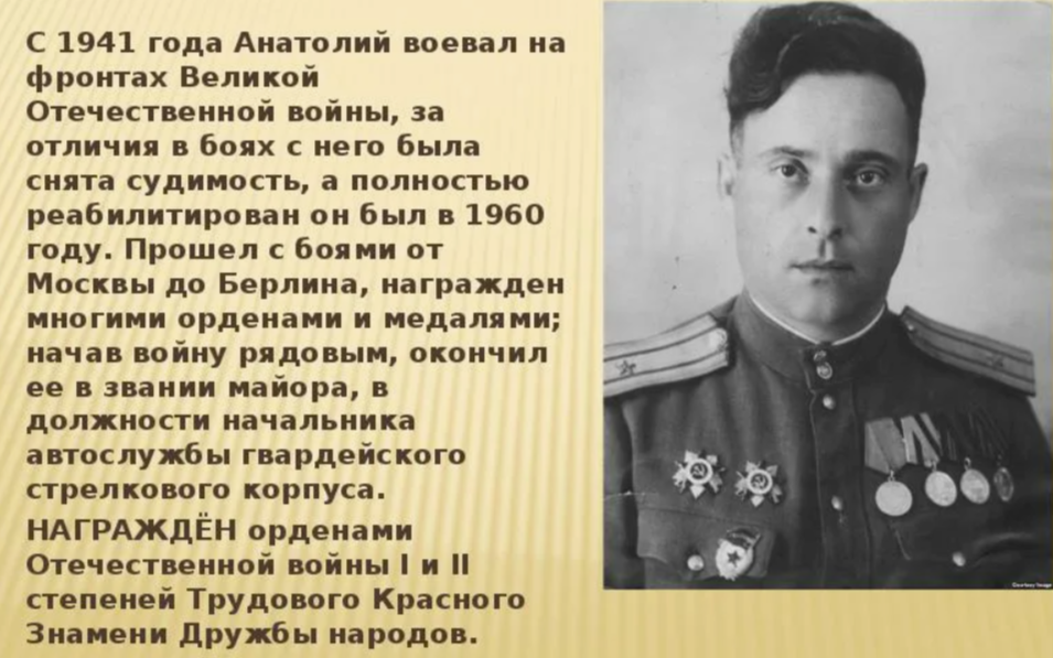 Возможно, именно благодаря этому личностному началу в его книгах, они очень популярны на протяжении долгих лет. После освобождения Анатолию Наумовичу пришлось помотаться по стране, т.к. путь в города ему был заказан, пройти дорогами Великой Отечественной. Только после Победы и полной реабилитации стали публиковаться ставшие популярными его произведения.