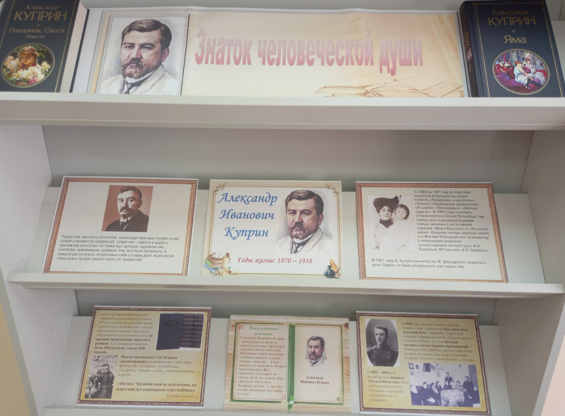 Юбилею Александра Ивановича Куприна в центральной библиотеке имени М.С. Малинина оформлена выставка - портрет «Знаток человеческой души».