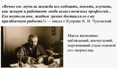 В его биографии отразились масштабные переломные события истории нашей Родины. Когда Куприну было около года, он потерял отца, несмотря на дворянское происхождение служившего мелким чиновником. В шесть лет он оказался в сиротском училище, затем окончив военное, служил в армии. Поняв, что профессия военного его не влечет, Куприн занимает должность секретаря в издательстве «Журнал для всех» Петербурга с весьма скромным жалованием.